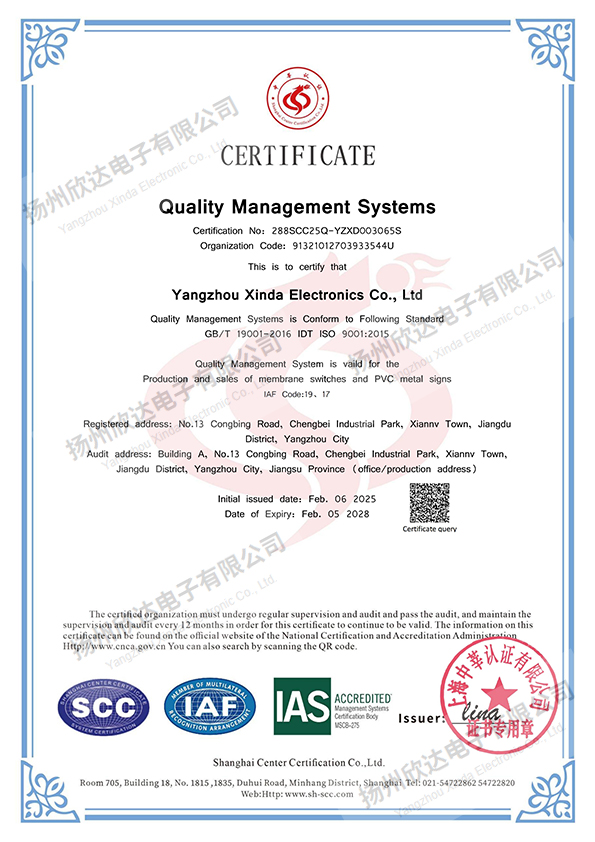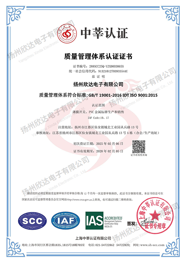 揚(yáng)州欣達(dá)電子有限公司是一家從事電子輕觸薄膜開(kāi)關(guān),薄膜面板及PVC、金屬標(biāo)牌,不干膠貼,噴塑、烤漆絲印面板等各種絲印工藝的有限責(zé)任公司。公司位于風(fēng)景秀麗的文化名城江蘇揚(yáng)州市江都區(qū)。自1993年建廠(chǎng)以來(lái),我們致力于信譽(yù)至上,顧客為首的原則,及時(shí)為廣大客戶(hù)提供合格滿(mǎn)意的產(chǎn)品:堅(jiān)持著質(zhì)量為首,持續(xù)改進(jìn)的方針,狠抓品質(zhì)管理,取得了客戶(hù)的認(rèn)可:履行著誠(chéng)信、互惠的宗旨,贏(yíng)得了客戶(hù)的支持和信任。目前公司擁有先進(jìn)的絲網(wǎng)印刷設(shè)備,熟練的業(yè)務(wù)技術(shù)骨干和嶄新適用的廠(chǎng)房,每年為全國(guó)各地的客戶(hù)提供數(shù)億的合格產(chǎn)品。我們把“誠(chéng)信、務(wù)實(shí)、求精、創(chuàng)新”作為我們的企業(yè)宗旨,在經(jīng)營(yíng)管理中貫徹“以人為本,精益求精”的經(jīng)營(yíng)理念;在生產(chǎn)管理中嚴(yán)格按ISO9001質(zhì)量體系落實(shí)生產(chǎn); 在為客戶(hù)服務(wù)過(guò)程中按照產(chǎn)品的分類(lèi)提供多種設(shè)計(jì)方案,讓我們產(chǎn)品更好體現(xiàn)客戶(hù)的理念。...