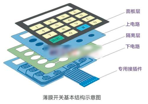 薄膜開關是集按鍵功用、指示元件、儀器面板為一體的一個操作系統(tǒng)。是選用PC,PET,FPC及雙面膠等軟性資料,運用絲網印刷技術制造而成的 多平面組合密封的集圖形、按鍵、標記符號顯示、導電及薄膜開關功用于一體的塑膠電子制品。廣泛應用于電子通訊、工業(yè)操控、醫(yī)療器械、汽車工業(yè)、儀器儀表、家用電器、兒童玩具、軍工設備等行業(yè)和領域。常見薄膜開關各部分組成原料: